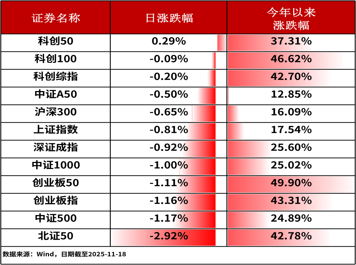 一、市场行情回顾 11月18日,A股三大股指普遍下跌,上证指数收跌0.81%,深证成指收跌0.92%,创业板指收跌1.16%。主流宽基指数中,科创50上涨0.29%,涨幅相对居 前。全市场共仅1,270余只股票上涨。港股主流指数集体收跌。其中,恒生中国央企指数下跌1.44%,跌幅相对最小。沪深两市成交额为19261亿元人民币, 相较上个交易日小幅增量。 | 证券名称 | 日涨跌幅 | 令年以来 涨跌幅 | | --- | --- | --- | | 科创20 | 0.29% | 37.31% | | 科创100 | -0.09% | 46.62% | | 科创综指 | -0.20% | 42.70% | | 中证A50 | -0.50% | 12.85% | | 沪深300 | -0.65% | 16.09% | | 上证指数 | -0.81% | 17.54% | | 深证成指 | -0.92% | 25.60% | | 中证1000 | -1.00% | 25.02% | | 创业板50 | -1.11% | 49.90% | | 创业板指 | -1.16% | 43.31% | | 中证500 | -1 ...