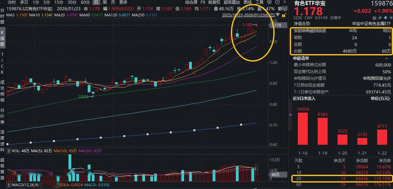 今日(1月23日)揽尽有色金属行业龙头的有色ETF华宝(159876)继续上攻,场内价格盘中涨超2%,现涨1.90%,冲击日线5连阳!伴随火热的行情,资 金蜂拥进场扫货!截至发稿,该ETF获资金实时净申购4620万份,拉长时间来看,近20日狂揽8.44亿元! 消息面上,格陵兰岛称选择丹麦和欧盟,已准备好迎接更大规模军事存在。特朗普称,格陵兰岛协议将赋予美方"全面军事进入权"。或由于格陵兰岛事件升 级,现货黄金直线冲高,站上4960美元,再创历史新高。 国泰海通表示,全球地缘政治局势的不确定性上升及各国央行持续购金,有利于支撑长期金价中枢。长期避险情绪以及供应端的紧张状态不会改变,价格上 涨逻辑依然稳固。高盛将2026年末金价预测大幅上调至5400美元/盎司,主因是私人投资者与各国央行需求激增。MKS PAMP认为,当前并非投机性顶峰, 5400美元目标对应30%的稳健涨幅,属长期趋势而非短期暴涨。 此外,中信建投指出,银价高企倒逼产业变革,光伏金属化革命的"铜"时代开启。考虑白银供给刚性+需要使用白银的新兴应用接力增长,预计白银供需长 期紧平衡。为控制成本,降低银耗成为光伏电池、组件企业的当务之急,而铜是最理 ...