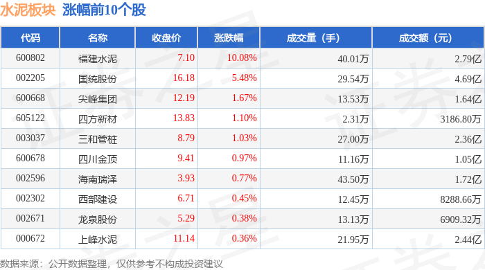 | 代码 | 名称 | 收盘价 | 涨跌幅 | 成交量(手) | 成交额(元) | | --- | --- | --- | --- | --- | --- | | 002233 | 塔牌集团 | 8.33 | -7.65% | 38.18万 | 3.21亿 | | 600801 | 华新水泥 | 21.77 | -2.33% | 25.38万 | 5.57 亿 | | 603616 | 韩建河山 | 5.59 | -1.76% | 24.48万 | 1.37亿 | | 600425 | 青松建化 | 4.65 | -1.69% | 43.15万 | 2.01亿 | | 600585 | 海螺水泥 | 23.39 | -1.52% | 22.09万 | 5.18亿 | | 600326 | 西藏天路 | 68'IT | -1.41% | 43.90万 | 5.24亿 | | 000877 | 天山股份 | 6.05 | -1.14% | 31.10万 | 1.88 Z | | 000401 | 金隅草矢 | 5.00 | -0.60% | 10.48万 | 5251.62万 | | 601992 | 金隅隼列 ...