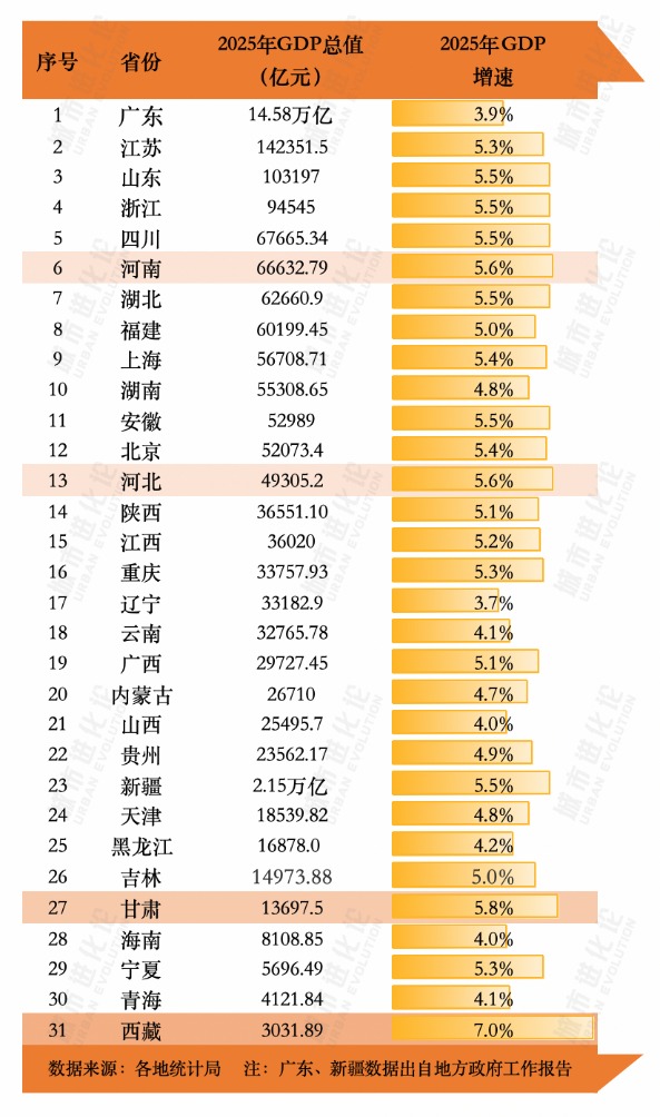 每经记者|杨欢 每经编辑|刘艳美 图片来源:摄图网_501740758 随着江苏公布2025年经济数据,全国31个省份2025年经济"成绩单"全部出炉。在GDP总量方面,广东、江苏、山东跻身"10万亿俱乐部",浙江、四川、河 南、湖北、福建、上海、湖南紧随其后,排在全国第四名至第十名,生产总值均超5万亿元。 | 序号 | 省份 | 2025年GDP总值 | 2025年 GDP | | --- | --- | --- | --- | | | | (亿元) | 增速 | | 1 | 广东 | 14.58万亿 | 3.9% | | 2 : | 江苏 | 142351.5 | 5.3% | | 3 | 山东 | 103197 | 5.5% | | 4 | 浙江 | 94545 | 5.5% | | 5 | 四川 | 67665.34 | 5.5% | | 6 | 河南 | 66632.79 | 5.6% | | 7 | 湖北 | 62660.9 | 5.5% | | 8 | 福建 | 60199.45 | 5.0% | | 9 | 下海 | 56708.71 | 5.4% | | 10 | 湖南 | 55308.65 ...