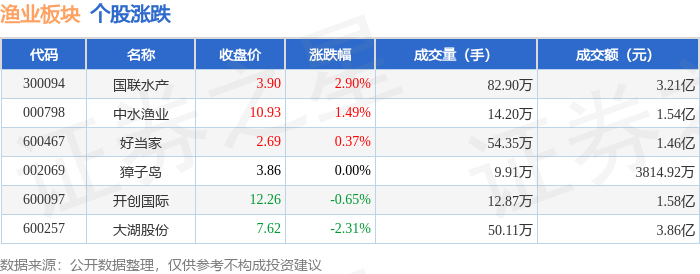 Core Viewpoint - The fishery sector experienced a slight increase of 0.41% on January 23, with Guolian Aquatic leading the gains, while the overall market indices also showed positive movement [1]. Group 1: Market Performance - On January 23, the Shanghai Composite Index closed at 4136.16, up 0.33%, and the Shenzhen Component Index closed at 14439.66, up 0.79% [1]. - The fishery sector stocks showed varied performance, with Guolian Aquatic rising by 2.90% to a closing price of 3.90, while Dahu Co. and Kaichuang International saw declines of 2.31% and 0.65%, respectively [1]. Group 2: Trading Volume and Capital Flow - The trading volume for Guolian Aquatic was 829,000 shares, with a transaction value of 321 million yuan, while Dahu Co. had a trading volume of 501,100 shares and a transaction value of 386 million yuan [1]. - The fishery sector saw a net outflow of 67.22 million yuan from main funds, while retail investors contributed a net inflow of 71.54 million yuan [1]. Group 3: Individual Stock Capital Flow - Guolian Aquatic had a main fund net inflow of 16.73 million yuan, but retail investors showed a net outflow of 10.69 million yuan [2]. - Dahu Co. experienced a significant main fund net outflow of 26.68 million yuan, while retail investors had a net inflow of 45.81 million yuan [2]. - Kaichuang International faced a main fund net outflow of 38.04 million yuan, with retail investors contributing a net inflow of 23.60 million yuan [2].