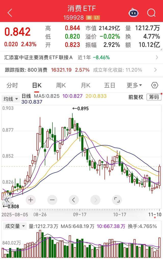 11月10日,市场窄幅震荡,大消费普涨,免税、食品饮料、酿酒行业、猪肉概念等细分领域领涨。截至 午间收盘,交易 CPI 转正的热门ETF——消费ETF(159928)涨2.43%,成交金额超10亿,已超前一交易日 全天水平;成分股泸州老窖涨超6%,古井贡酒、山西汾酒涨超5%,牧原股份涨超3%,伊利股份、五粮 液涨超2%。 消费 ETF < 159928 ■ L1 0.844 市值 214.29亿 量 1212.7万 島 0.842 0.820 溢价 -0.02% 换 4.77% ffe 0.020 2.43% 额 10.12亿 0.823 振幅 2.92% 开 汇添富中证主要消费ETF联接A 近1年-8.46% 跟踪指数: 800 消费 16321.19 2.57% 成立年化收益: 11.20% 分时 月K 五日 圓K 日K 曲 云 O 日线 MA5:0.825 10:0.827 20:0.833 筹码 前复权 均线 ▼ 30:0.837 0.903 ←0.895 0.877 0.852 0.808 2025-08-0 10- 量:1212.73万 MA5:648.19万 10:667.38万 换手:4.76 ...