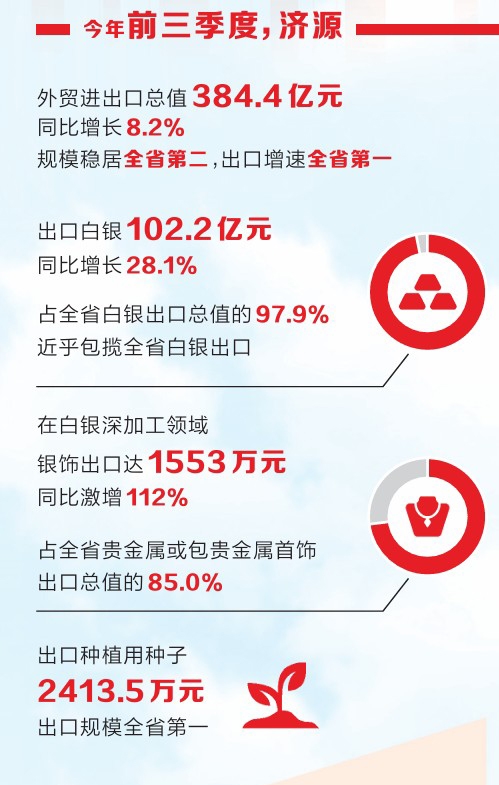 Group 1 - The total import and export value of Jiyuan in the first three quarters reached 38.44 billion yuan, a year-on-year increase of 8.2%, ranking second in the province, with the highest export growth rate in the province [2] - Jiyuan exported silver worth 10.22 billion yuan, a year-on-year increase of 28.1%, accounting for 97.9% of the province's total silver exports [2] - The export of silver jewelry reached 15.53 million yuan, a significant increase of 112% year-on-year, representing 85.0% of the province's total exports of precious metal or semi-precious metal jewelry [2] Group 2 - Jiyuan's export of planting seeds amounted to 2.4135 million yuan, ranking first in the province, with Qingyin Seed Industry becoming a key player in "Jiyuan Good Seeds" [2] - Jiyuan Sunshine Food Co., Ltd. received official registration approval from the EU, achieving a breakthrough in rabbit meat exports to the EU, with an additional export value of 2.51 million yuan this year [2] Group 3 - The impressive foreign trade performance is attributed to Jiyuan's focus on characteristic development and optimized industrial layout, along with the Jiyuan Customs' precise support for local advantageous industries [3] - Jiyuan Customs has implemented customized services for key agricultural industries, reducing average customs clearance time by over 30% and resolving over 20 export-related issues for agricultural enterprises this year [3] - For the silver industry, Jiyuan Customs has tailored solutions to enhance customs efficiency, helping enterprises transition from raw silver to high-end jewelry for international markets [3] Group 4 - The 20th Central Committee of the Communist Party of China emphasized expanding high-level opening-up and creating a new situation of win-win cooperation, which Jiyuan Customs aims to implement by optimizing regulatory services and supporting more "Jiyuan-made" products to enter the global market [4]