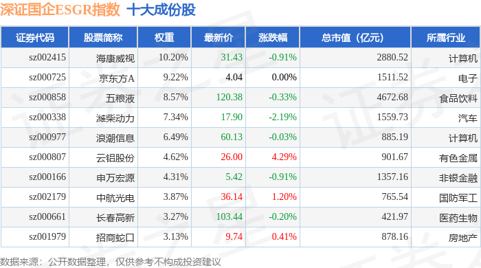 Core Points - The Shenzhen State-owned Enterprise ESGR Index (470055) closed at 1615.9 points, down 0.46%, with a trading volume of 36.083 billion yuan and a turnover rate of 1.3% [1] - Among the index constituents, 14 stocks rose while 35 fell, with Zhonglai Co. leading the gainers at 4.36% and Jiadian Co. leading the decliners at 6.33% [1] Index Constituents Summary - The top ten constituents of the Shenzhen State-owned Enterprise ESGR Index are as follows: - Hikvision (sz002415) holds a weight of 10.20% and closed at 31.43, down 0.91% with a total market value of 288.052 billion yuan [1] - BOE Technology Group (sz000725) has a weight of 9.22%, closing at 4.04 with no change, and a market value of 151.152 billion yuan [1] - Wrigley (sz000858) has a weight of 8.57%, closing at 120.38, down 0.33%, with a market value of 467.268 billion yuan [1] - Weichai Power (sz000338) has a weight of 7.34%, closing at 17.90, down 2.19%, with a market value of 155.973 billion yuan [1] - Inspur Information (sz000977) has a weight of 6.49%, closing at 60.13, down 0.03%, with a market value of 88.519 billion yuan [1] - Yun Aluminum (sz000807) has a weight of 4.62%, closing at 26.00, up 4.29%, with a market value of 90.167 billion yuan [1] - Shenwan Hongyuan (sz000166) has a weight of 4.31%, closing at 5.42, down 0.91%, with a market value of 135.716 billion yuan [1] - AVIC Optoelectronics (sz002179) has a weight of 3.87%, closing at 36.14, up 1.20%, with a market value of 76.554 billion yuan [1] - Changchun High-tech (sz000661) has a weight of 3.27%, closing at 103.44, down 0.20%, with a market value of 42.197 billion yuan [1] - China Merchants Shekou (sz001979) has a weight of 3.13%, closing at 9.74, up 0.41%, with a market value of 87.816 billion yuan [1] Capital Flow Analysis - The index constituents experienced a net outflow of 1.442 billion yuan from institutional investors, while retail investors saw a net inflow of 839 million yuan [1] - The detailed capital flow for selected stocks includes: - Zhongtung High-tech (000657) saw a net inflow of 168 million yuan from institutional investors [2] - Yun Aluminum (000807) had a net inflow of 137 million yuan from institutional investors [2] - BOE Technology Group (000725) recorded a net inflow of 43.82 million yuan from institutional investors [2] - Changchun High-tech (000661) had a net inflow of 27.15 million yuan from institutional investors [2] - AVIC Optoelectronics (002179) saw a net inflow of 15.82 million yuan from institutional investors [2]