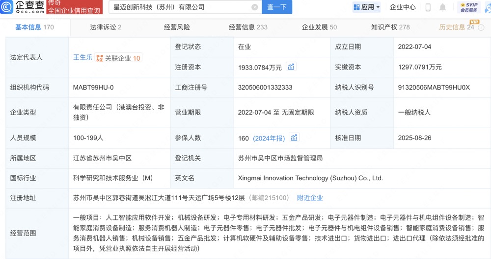 Core Insights - Xingmai Innovation Technology (Suzhou) Co., Ltd. has recently undergone a business change, adding Meituan-related company Chengdu Longzhu Equity Investment Fund Partnership (Limited Partnership) as a shareholder [1] - The company, established in 2022, focuses on the research and sales of outdoor cleaning robots, with a legal representative named Wang Shengle [1][6] - The company has successfully secured several million yuan in angel round financing and has a team with extensive experience in robotics and consumer electronics [6] Company Overview - Xingmai Innovation is a private company with a registered capital of approximately 193.3 million yuan, which has increased by 51.2 million yuan recently [2] - The company operates in the scientific research and technical services industry, specifically in the development of artificial intelligence application software, mechanical equipment, and electronic materials [2][9] - The company has a workforce of 100-199 employees and is recognized as a technology-based small and medium-sized enterprise [9] Business Development - The company is currently in the Pre-A funding stage and has a ranking of 22nd in the IoT popularity in Suzhou and 180th overall in Suzhou [9] - The average salary for 63.9% of positions is between 15,000 to 30,000 yuan, with a slight decrease of 3% compared to the previous year [9] - The company has a strong focus on recruiting high-education talent, with 94.1% of positions requiring at least a bachelor's degree [9]