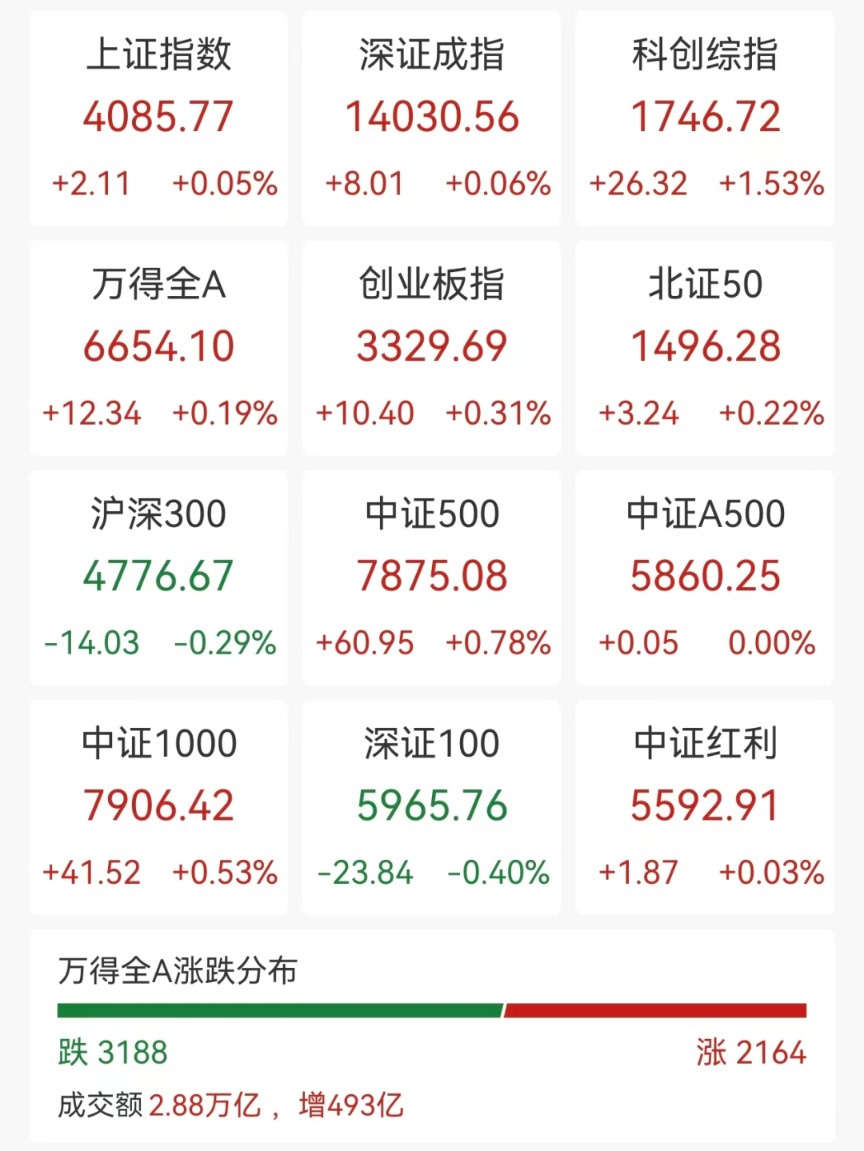 股市三点钟丨14连阳!沪指收涨0.05%,两市成交额2.85万亿元