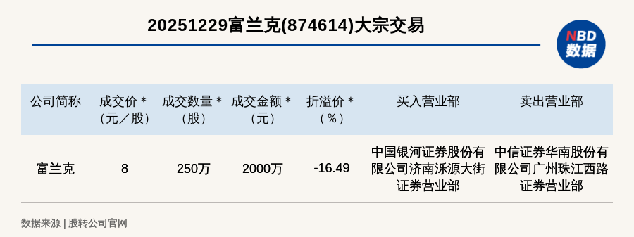 (记者 曾健辉) | 公司简称 成交价 * | 成交数量 * 成交金额 * | 20251229富兰克(874614)大宗交易 | 折溢价 * | 卖出营业部 买入营业部 | | --- | --- | --- | --- | --- | | (元/股) | (股) | (元) | ( % ) | | | 富兰克 8 | 250万 | 2000万 | -16.49 | 中国银河证券股份有 中信证券华南股份有 限公司济南深源大街 限公司广州珠江西路 | | | | | | 证券营业部 证券营业部 | 每经讯,2025年12月29日,新三板创新层公司富兰克(874614,收盘价:9.58元)发生一笔大宗交易,成交价8元/股,成交数量 250万股,成交金额2000万元,折价16.49%。买入营业部是中国银河证券股份有限公司济南泺源大街证券营业部,卖出营业部是 中信证券华南股份有限公司广州珠江西路证券营业部。 免责声明:本文内容与数据仅供参考,不构成投资建议,使用前核实。据此操作,风险自担。 每日经济新闻 ...