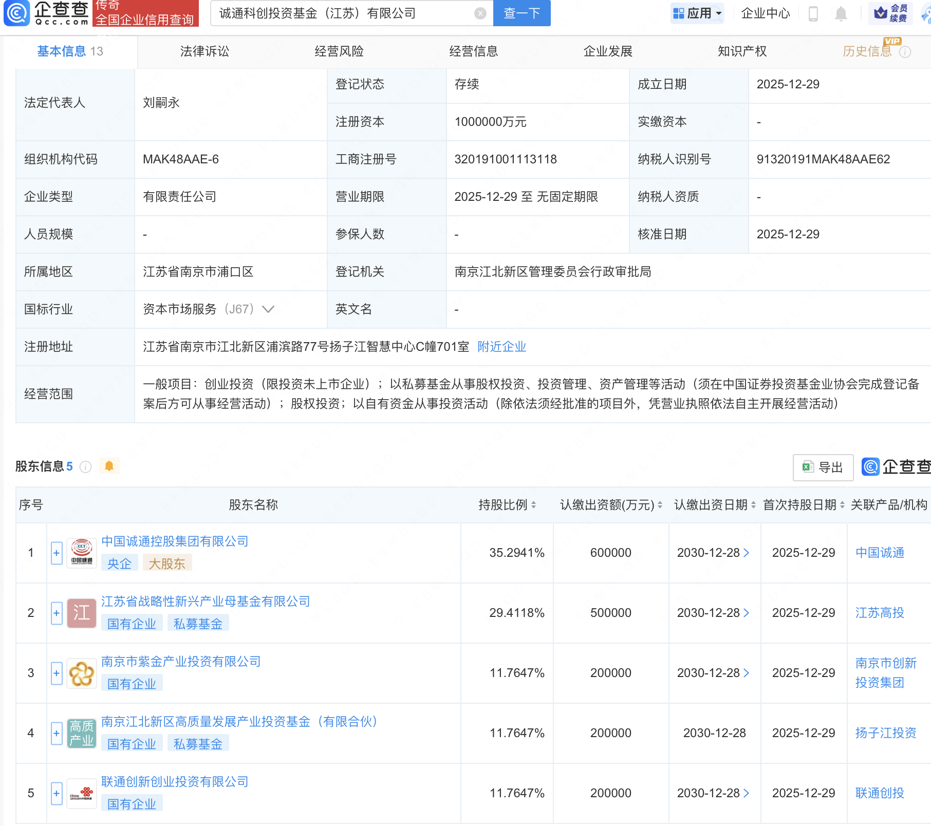 Group 1 - The core point of the news is the establishment of the Chengtong Science and Technology Investment Fund (Jiangsu) Co., Ltd. with a capital contribution of 10 billion yuan, focusing on venture capital and private equity investments in unlisted companies [1][2] - The fund's business scope includes venture capital limited to investments in unlisted enterprises, private equity fund activities, investment management, and asset management [1][2] - The company is registered in Nanjing, Jiangsu Province, and has a legal representative named Liu Siyong, with a registration status of "active" [2] Group 2 - The shareholders of the fund include China Chengtong Holdings Group Co., Ltd. with a 35.29% stake, Jiangsu Strategic Emerging Industry Mother Fund Co., Ltd. with a 29.41% stake, and other state-owned enterprises [3][4] - The fund is classified under the capital market services industry [2] - The registered address of the company is located at Yangtze River Smart Center, Nanjing [2]