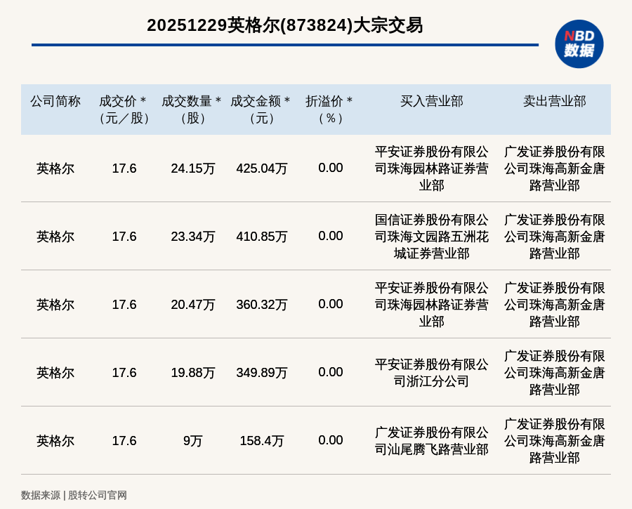 (记者 曾健辉) 每经讯,2025年12月29日,新三板创新层公司英格尔(873824,收盘价:17.6元)发生5笔大宗交易,总成交金额为1704.5万 元,成交金额最高的一笔成交价17.6元/股,成交数量24.15万股,成交金额425.04万元,为平价交易。买入营业部是平安证券股 份有限公司珠海园林路证券营业部,卖出营业部是广发证券股份有限公司珠海高新金唐路营业部。 | | | | 20251229英格尔(873824)大宗交易 | | | | | --- | --- | --- | --- | --- | --- | --- | | 公司简称 | 成交价 * | 成交数量* 成交金额 * | | 折溢价 * | 买入营业部 | 卖出营业部 | | | (元/股) | (股) | (元) | ( % ) | | | | 英格尔 | 17.6 | 24 15万 | 425.04万 | 0.00 | 平安证券股份有限公 司珠海园林路证券营 | 广发证券股份有限 公司珠海高新金唐 | | | | | | | 业部 | 路营业部 | | | | | | | 国信证券股份有限公 | 广发证券股份有限 | | 英格尔 ...