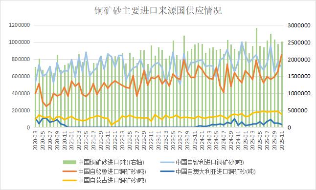Core Insights - China's copper ore and concentrate imports in November 2025 reached 2,526,194.63 tons, reflecting a month-on-month increase of 3.05% and a year-on-year growth of 13.13% [1] Group 1: Import Sources - Peru's copper ore supply surged nearly 30% to 852,529 tons, becoming the largest supplier for the month, surpassing Chile [1] - Chile's copper ore shipments declined by approximately 8% to 704,596 tons, marking a significant drop in its supply [1] - Mongolia, the third-largest supplier, also experienced a decrease in its copper ore shipments [1]