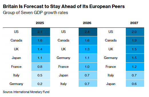随着通胀水平向2%目标靠拢,英国将摆脱当前3.2%的高通胀状态,结束与其他同类经济体的偏离态 势。而就在去年10月,IMF还预测英国今年通胀将停滞在2.5%。 IMF预计,英国央行将把基准利率从当前的3.75%下调。不过该组织同时敦促英国央行保持"审慎立 场",直至通胀率稳定在目标水平;此前IMF曾表示,预计英国基准利率最终将稳定在3.5%。 国际货币基金组织(IMF)最新预测显示,受就业市场疲软导致薪资涨幅收窄影响,英国通胀率将于今年 年底回落至2%的政策目标水平。 英国去年的经济增速已超过法国、德国和意大利,今明两年仍将稳居七国集团(G7)中欧洲经济体之首, 但与美国、加拿大的差距仍会持续扩大。从预测数据来看,英国的经济增速也高于日本。 IMF将英国2025年的经济增长预期从1.3%上调至1.4%,2026年增长预期则维持不变。该组织指出,英国 与西班牙均从人工智能(AI)投资热潮中获益,但两国的相关投资规模远不及美国。 这家全球监管机构在1月《世界经济展望》更新报告中表示,尽管特朗普掀起贸易战,全球经济仍展现 出超预期的韧性,预计今年增长将保持在3.3%,2027年微降至3.2%。报告称,稳健前景得益于 ...