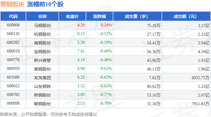 证券之星消息,12月30日普钢板块较上一交易日下跌0.72%,武进不锈领跌。当日上证指数报收于 3965.12,下跌0.0%。深证成指报收于13604.07,上涨0.49%。普钢板块个股涨跌见下表: | 代码 | 名称 | 收盘价 | 涨跌幅 | 成交量(手) | 成交额(元) | | | --- | --- | --- | --- | --- | --- | --- | | 600808 | 马钢股份 | 4.20 | 0.24% | 75.28万 | | 3.17亿 | | 600126 | 杭钢股份 | 8.15 | -0.12% | 27.17万 | | 2.22亿 | | 600282 | 南钢股份 | 5.38 | -0.19% | 54.41万 | | 2.94亿 | | 600019 | 宝钢股份 | 7.41 | -0.40% | 56.30万 | | 4.19亿 | | 000778 | 新兴铸管 | 4.18 | -0.48% | 45.90万 | | 1.91亿 | | 000959 | 首钢股份 | 4.90 | -0.61% | 40.13万 | | 1.96/Z | | 6016 ...