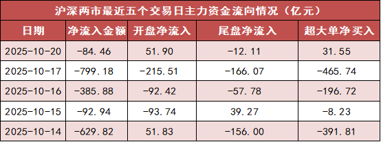 10月20日,A股市场整体上涨。 截至收盘,上证指数收报3863.89点,上涨0.63%;深证成指收报12813.21点,上涨0.98%;创业板指收报2993.45 点,上涨1.98%。两市合计成交17376.05亿元,较上一交易日减少2005.11亿元。 1. 两市主力资金净流出超80亿元 今日沪深两市主力资金开盘净流入51.9亿元,尾盘净流出12.11亿元,全天净流出84.46亿元。 | | | 沪深两市最近五个交易日主力资金流向情况(亿元) | | | | --- | --- | --- | --- | --- | | 日期 | | 净流入金额 开盘净流入 | 尾盘净流入 | 超大单净买入 | | 2025-10-20 | -84. 46 | 51. 90 | -12. 11 | 31.55 | | 2025-10-17 | -799.18 | -215. 51 | -166. 07 | -465. 74 | | 2025-10-16 | -385.88 | -92. 42 | -57. 78 | -196. 72 | | 2025-10-15 | -92. 94 | -93.74 | 39.27 | ...