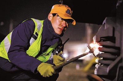 (来源:中国妇女报) 一列载满电煤的列车裹挟风尘缓缓驶入站台,车轮与铁轨的摩擦声打破了清晨的寂静。"工长接车,技 检8道22003次,编组48辆(节),牵引总重4620吨,牛家梁到榆次。"列检值班室的指令通过对讲机传 来,带着电流杂音却格外清晰。 "现场收到。"一声清亮沉稳的回应响起。身着深蓝色工服,外罩亮眼的黄绿色反光马甲,寒风吹红了工 长任智宇的脸颊,却挡不住他眼中的专注。 转自:中国妇女报 任智宇在对货车走行部枕簧进行检查。 李玉在对限压阀做漏泄试验。 受访者供图 □ 中国妇女报全媒体记者 党柏峰 隆冬时节,塞北榆林寒风刺骨。毛乌素沙漠边缘的寒风如冰刃般掠过中国铁路西安局集团公司榆林车辆 段榆林运用车间的铁轨,卷起沙尘在站台边盘旋。低温中,货车检车员呼出的白气瞬间凝成浓雾,凝结 在安全帽檐与衣领上。 "伙计们,看车了!"随着任智宇的召唤,5名工友迅速集结,他们身着厚重皮衣皮裤,手持检修铁锤, 稳步走向待检列车,靴底踩在冰冷的沙地上发出"咯吱咯吱"的声响。 两名工友迅速在列车首尾指定位置插上防护红旗,旗帜在寒风中猎猎作响。很快,大家便分散在列车两 侧弯腰检修,"叮,叮叮,当,当当……"清脆的敲击声此起彼伏 ...