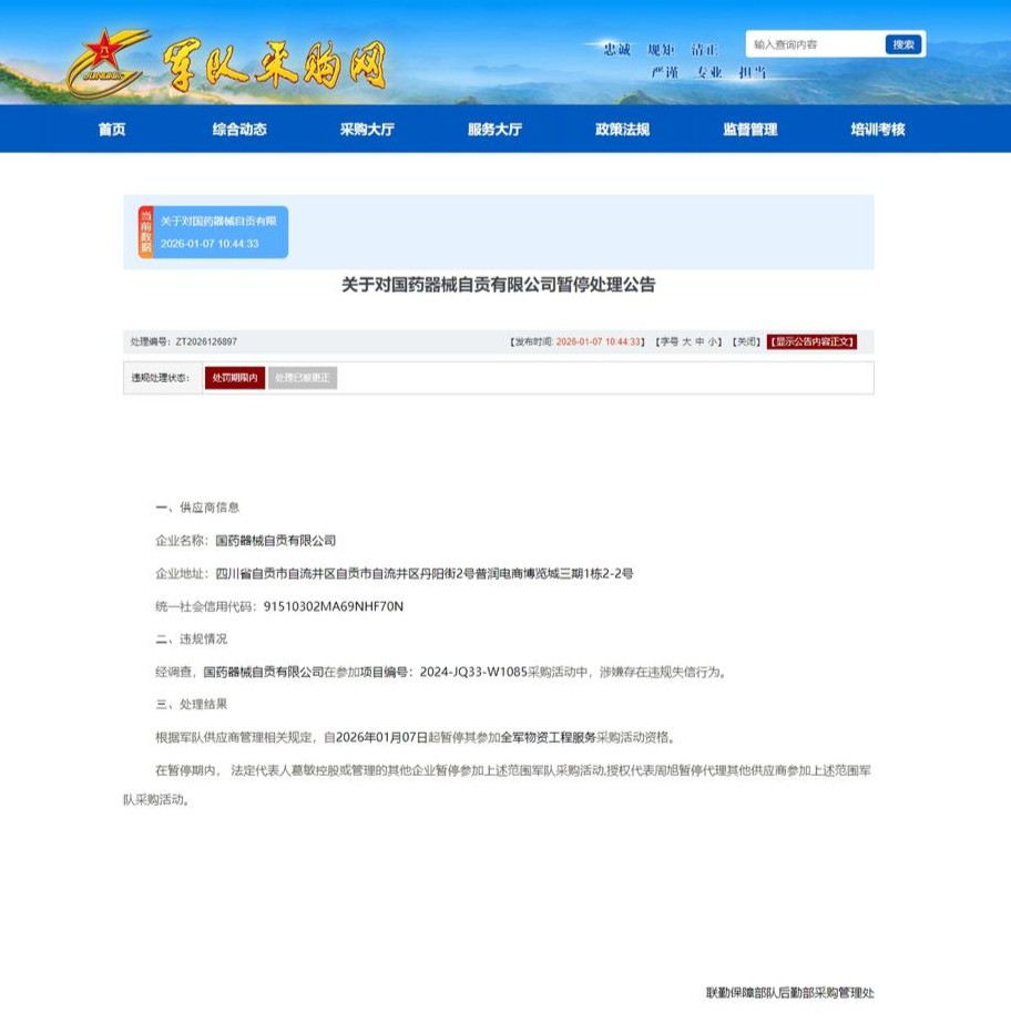 公开资料显示,国药器械自贡有限公司成立于2019-09-04,法定代表人为唐晓玲,注册资本为1000万元,统一社会信用代码为 91510302MA69NHF70N,企业注册地址位于自贡市自流井区丹阳街2号普润电商博览城三期1栋2-2号,所属行业为零售业,为国 药集团四川省医疗器械有限公司的控股子公司。 近日,联勤保障部队后勤部采购管理处发布公告,依规对国药器械自贡有限公司及其相关责任人员作出严肃处理,暂停其参加全 军物资、工程、服务采购活动的资格。 根据暂停处理公告显示,国药器械自贡有限公司参与军队采购活动中,存在"借用资质"等违规行为,违反了军队供应商管理的相 关规定。联勤保障部队后勤部采购管理处依据《军队物资工程服务采购管理规定》等相关法规,决定自2026年1月7日起,暂停国 药器械自贡有限公司参加全军所有单位的物资、工程、服务集中采购活动资格。 ...