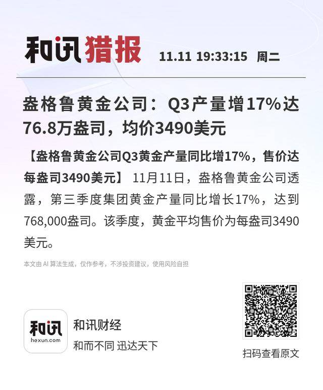 【盎格鲁黄金公司Q3黄金产量同比增17%,售价达每盎司3490美元】11月11日,盎格鲁黄金公司透 露,第三季度集团黄金产量同比增长17%,达到768,000盎司。该季度,黄金平均售价为每盎司3490美 元。 本文由 AI算法生成,仅作参考,不涉投资建议,使用风险自担 ...