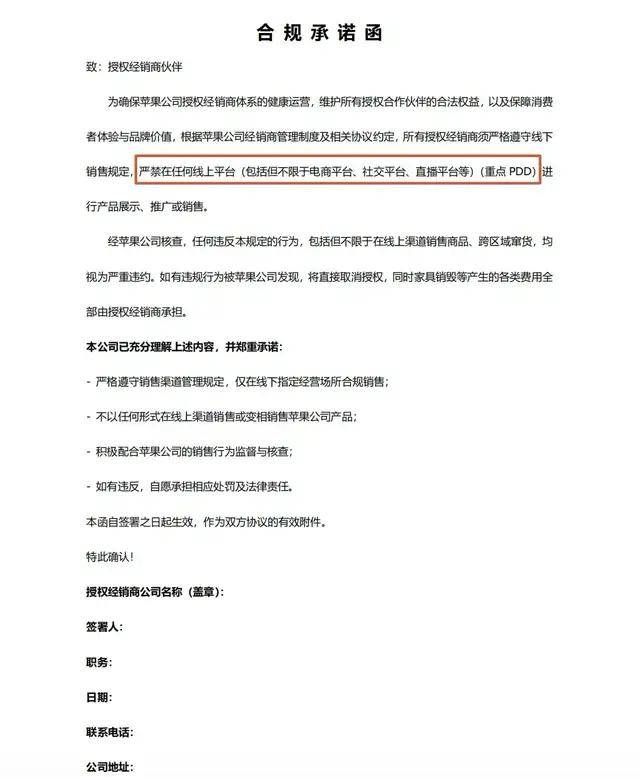 Core Viewpoint - Apple has reiterated its policy prohibiting authorized offline dealers in China from collaborating with any e-commerce platforms, aiming to maintain its pricing structure amidst declining revenue in the Greater China region [1] Group 1: Company Policy - Apple has issued a notification to all authorized dealers in China, forbidding them from engaging in product display, promotion, or sales on e-commerce, social media, and live streaming platforms [1] - This policy is a reinforcement of existing regulations, with the primary goal of preventing disruption to the pricing system [1] Group 2: Financial Performance - In the fourth fiscal quarter of 2025, Apple's revenue in the Greater China region was reported at $14.493 billion, a decline of 3.6% compared to $15.033 billion in the same period last year [1] - The Greater China market is the only region globally where Apple experienced a revenue decrease [1] Group 3: Future Outlook - Tim Cook, Apple's CEO, expressed optimism about the company's growth prospects in China, anticipating a recovery in revenue for the fourth quarter of 2025, driven by strong momentum from the iPhone 17 series [1] - Cook described the Chinese market as "vibrant and dynamic," indicating confidence in future growth [1]