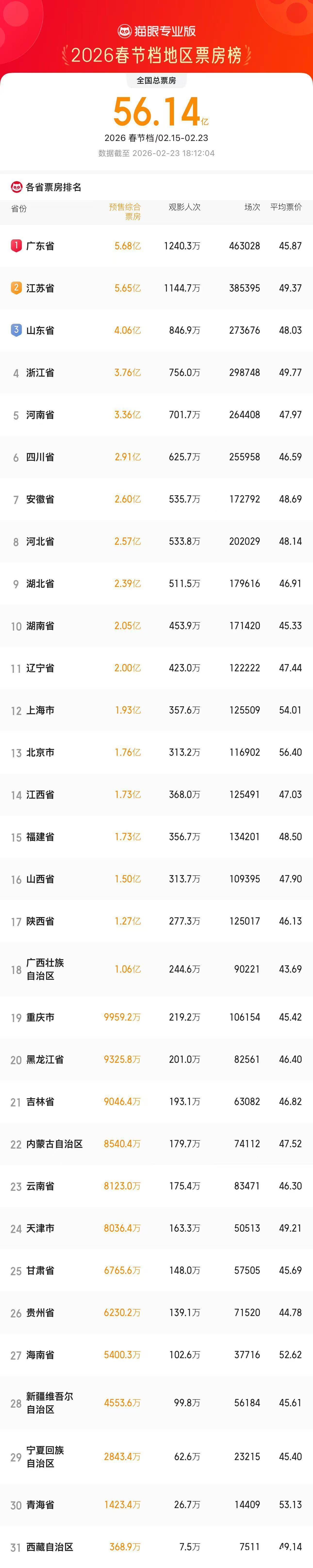 广东电影市场再迎喜讯。猫眼专业版数据显示,截至2月23日18时,广东以5.68亿元的档期票房反超其他省市,占比10.1%,五年后强势重返全国第一。从本 土出品影片的表现抢眼,到"票根经济"的全面爆发,再到"跟着电影游广东"的全民热潮,广东电影市场正以多元融合的发展态势,书写着中国文化消费的新 范本。 五年砥砺 广东重回春节档票房全国第一 2026年春节档,广东以票房、放映场次和观影人数等多个第一,用实打实的数据印证了"第一票仓"的深厚底蕴。 | 4 浙江省 | 3.76亿 | 756.0万 | 298748 | | --- | --- | --- | --- | | 5 河南省 | 3.36亿 | 701.7万 | 264408 | | 6 四川省 | 2.91亿 | 625.7万 | 255958 | | 7 安徽省 | 2.60亿 | 535.7万 | 172792 | | 8 河北省 | 2.57亿 | 533.8万 | 202029 | | 9 湖北省 | 2.39亿 | 511.5万 | 179616 | | 10 湖南省 | 2.05亿 | 453.9万 | 171420 | | 11 辽宁省 | ...