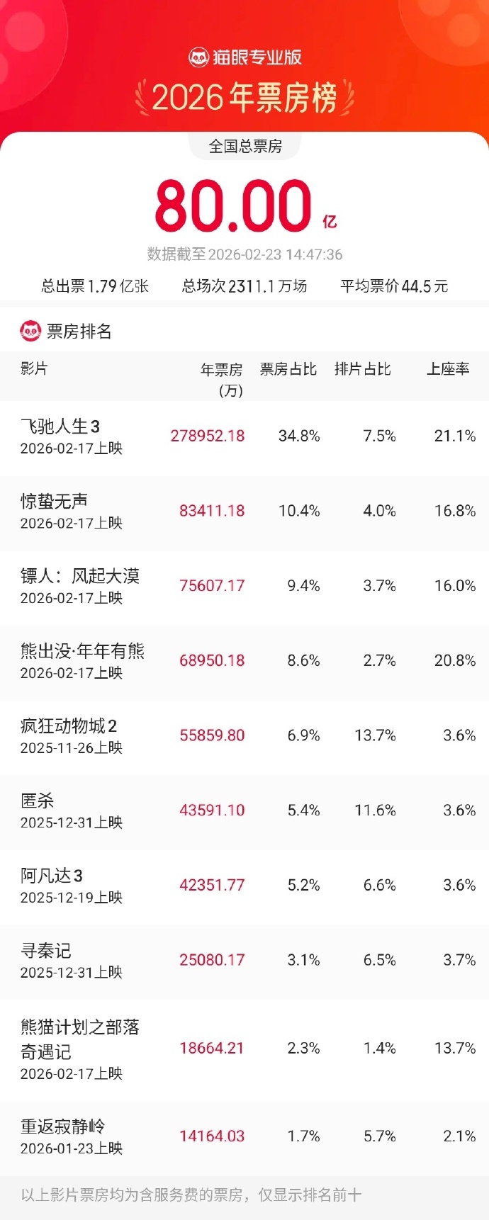 0 票房排名 (四) 理眠会小版 (2026年票房榜) 全国总票房 47, 数据截至2026-02-23 14:47:36 总出票 1.79亿张 平均票价 44.5元 总场次2311.1万场 | 影片 | 年票房 | 票房占比 排片占比 | | 上座率 | | --- | --- | --- | --- | --- | | | (万) | | | | | 飞驰人生3 2026-02-17上映 | 278952.18 | 34.8% | 7.5% | 21.1% | | 惊蛰无声 2026-02-17上映 | 83411.18 | 10.4% | 4.0% | 16.8% | | 镖人:风起大漠 2026-02-17上映 | 75607.17 | 9.4% | 3.7% | 16.0% | | 熊出没·年年有熊 2026-02-17上映 | 68950.18 | 8.6% | 2.7% | 20.8% | | 疯狂动物城2 | 55859.80 | 6.9% | 13.7% | 3.6% | | --- | --- | --- | --- | --- | | 2025-11-26上映 | | | | | | 匿 ...