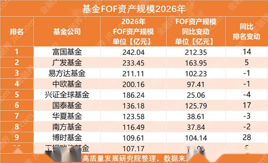 Core Insights - The public FOF (Fund of Funds) market is set to exceed 240 billion yuan by the end of 2025, marking a significant milestone in the industry [1] - The issuance of public FOFs continues to rise in 2026, with 36 new products launched in just over a month, raising over 33.5 billion yuan, solidifying its position as a key player in the new fund market [1] - The transition to FOF 2.0 is characterized by a shift from long-term holding strategies to shorter holding periods and improved liquidity, with a focus on diversified asset allocation [1] Industry Development - The development of public FOFs can be divided into two phases: the initial phase starting in 2017, where products primarily focused on "fixed income plus" strategies, with leading institutions like China Merchants and Minsheng gaining significant market share [2] - As of February 10, 2026, the top public FOF manager is FuGuo Fund, with a management scale of 24.2 billion yuan, an increase of over 21.2 billion yuan year-on-year, moving up 14 positions [2] - Other notable funds include Guangfa, E Fund, and Zhongou Fund, each managing over 20 billion yuan, while Xingzheng Global Fund has dropped to fifth place with a scale of 18.6 billion yuan [2] Fund Management Scale - FuGuo Fund: 24.2 billion yuan, up 21.2 billion yuan, rank up 14 [3] - Guangfa Fund: 23.3 billion yuan, up 16.4 billion yuan, rank up 5 [3] - E Fund: 21.1 billion yuan, up 10.2 billion yuan, rank down 1 [3] - Zhongou Fund: 20.0 billion yuan, up 9.7 billion yuan, rank down 1 [3] - Xingzheng Global Fund: 18.6 billion yuan, up 2.5 billion yuan, rank down 4 [3] - Guotai Fund: 13.6 billion yuan, up 12.6 billion yuan, rank up 17 [3] - Boshi Fund: 10.9 billion yuan, up 10.4 billion yuan, rank up 28 [3]
