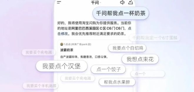 1月15日,千问App宣布接入淘宝、支付宝、淘宝闪购等阿里旗下业务,并一口气上线超400项AI办事功 能。通过最新版千问App,用户只需一句指令——如"点40杯奶茶"或"订四姑娘山徒步装备"——即可在 端内完成咨询、推荐、下单、支付全流程,无需跳转。 全文共2674字,阅读大约需要6分钟 据北京商报记者体验,用户对千问App提出购物需求,并不是每次都可以直接下单。 北京商报记者丨魏蔚 阿里想把命运牢牢握在自己手里,尤其AI时代。 在千问App之前,用户通过豆包也可以下单商品,虽步骤略有不同,但双方意图一致:不只做信息中 介,要成为任务执行的起点。 这场围绕"帮我……"的争夺,已超越功能比拼,直指下一代流量入口的核心。当AI助手真正开始"替你 办事",信任、体验与生态将成为决定胜负的关键变量。 千问的三头六臂 1月15日,千问App宣布,在全球首次实现点外卖、买东西、订机票等AI购物功能,并向所有用户开放 测试,实现了千问App刚上线时的承诺。 干问~ N +1 = 霸王茶姬( ■■■ 轻因·伯牙绝弦x40 本店热销榜第6名 章看胖情 20分钟 2.3km 单价约 ¥ 15.0 选它 如果需要调整数量、规格或送 ...