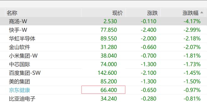 记者丨张伟泽 编辑丨李莹亮,和佳 继昨日大涨后,今日港股AI股开始回调走弱。1月13日午后,港股AI应用板块午后继续降温。截至发 稿,智谱(02513.HK)跌超13%,MINIMAX-WP(00100.HK)跌10%,商汤(00020.HK)跌超4%,港股科网 股多股下挫,快手、华虹半导体、金山软件跌超2%,阿里巴巴、哔哩哔哩、小鹏汽车飘红,截至发稿 涨幅超2%。 | 名称 | 现价 | 涨跌 | 涨跌幅 - | | --- | --- | --- | --- | | 商汤-W | 2.530 | -0.110 | -4.17% | | 快手-W | 77.850 | -2.400 | -2.99% | | 花机未曾体 | 89.550 | -2.000 | -2.18% | | 金山软件 | 31.280 | -0.660 | -2.07% | | 小米集团-W | 38.040 | -0.700 | -1.81% | | 中本国际 | 74.000 | -1.300 | -1.73% | | 百度集团-SW | 142.600 | -2.100 | -1.45% | | 美的集团 | 85.200 | ...