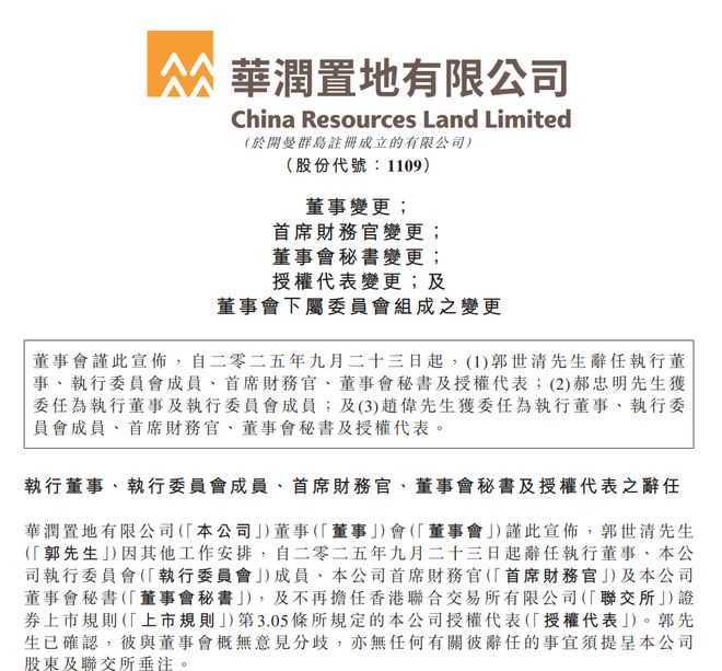Core Viewpoint - China Resources Land announced a series of management changes, including the resignation of CFO Guo Shiqing and the appointment of Hao Zhongming and Zhao Wei to key executive positions [2][5][6] Management Changes - Guo Shiqing will resign as Executive Director, Executive Committee member, CFO, and Company Secretary effective September 23, 2025, due to other work commitments [2] - Hao Zhongming has been appointed as Executive Director and Executive Committee member starting September 23, 2025 [2] - Zhao Wei will take over as Executive Director, Executive Committee member, CFO, Company Secretary, and Authorized Representative from September 23, 2025 [2] Background of Key Personnel - Guo Shiqing joined China Resources Land in 2001 and has held various financial management roles, including CFO since June 2020 [5][6] - Hao Zhongming, 54, joined China Resources Land in October 2022, previously serving in various roles within the government and the China Resources Group [6][7] - Zhao Wei, 53, has over 20 years of financial management experience within the China Resources Group and will assume the CFO role [6][7] Compensation and Terms - Both Hao Zhongming and Zhao Wei have signed a three-year appointment letter with a pre-tax basic monthly salary of RMB 62,800, along with performance-based bonuses [7] Company Overview - China Resources Land is a core business unit of China Resources Group, established in 1994 and listed on the Hong Kong Stock Exchange in 1996 [8] - The company reported a revenue of RMB 94.92 billion for the first half of 2025, a year-on-year increase of 19.9%, with a net profit attributable to shareholders of RMB 11.88 billion, up 16.2% [8]