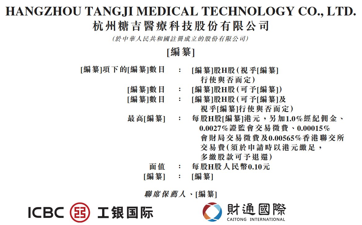 智通财经APP获悉,据港交所2月9日披露,杭州糖吉医疗科技股份有限公司(简称:糖吉医疗)向港交所 主板递交上市申请书,工银国际、财通国际为其联席保荐人。 | 纂]項下的[编纂]數目 : [编纂]股H股(視乎[编纂] | | | --- | --- | | 行使與合向定) | | | [编纂]數目 | : [编纂]股H股(可予[编纂]) | | [编纂]數目 | : [编纂]股H股(可于编纂]及 | | 視乎[编纂]行使與否而定) | | | 最高[编纂] .. | 每股H股[编纂]港元,另加1.0%經紀冊金、 | | 0.0027%證監會交易微費、0.00015% | | | 會財局交易徵費及0.00565%香港聯交所 | | | 交易費(須於申請時以港元繳足, | | | 多織股款可予想還) | | | 面值 | : 每股H股人民幣0.10元 | | 【湯養】 | : [编纂] | | 聯席保薦人 ·[编纂] | | 公司简介 招股书披露,糖吉医疗是一家立足中国的医疗器械公司,专注于为代谢性疾病的治疗及全周期管理提供 创新解决方案。公司战略构建了涵盖肥胖及代谢性疾病治疗器械与适配器械及全周期管理产品的产品管 ...