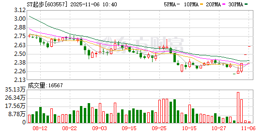 公司发布的三季报数据显示,前三季公司共实现营业收入1.15亿元,同比下降35.22%,实现净利 润-8183.46万元,同比下降46.33%,基本每股收益为-0.1356元。 据天眼查APP显示,起步股份有限公司成立于2009年12月28日,注册资本62343.6888万人民币。(数据 宝) ST起步盘中涨停,已连收3个涨停板,截至9:25,该股报2.61元,换手率0.13%,成交量82.17万股,成 交金额214.46万元,涨停板封单金额为8516.93万元。连续涨停期间,该股累计上涨15.49%,累计换手 率为4.56%。最新A股总市值达16.27亿元。 (文章来源:证券时报网) 近日该股表现 | 日期 | 当日涨跌幅(%) | 换手率(%) | 主力资金净流入(万元) | | --- | --- | --- | --- | | 2025.11.05 | 5.06 | 0.42 | 268.97 | | 2025.11.04 | 4.87 | 4.01 | 355.54 | | 2025.11.03 | 1.80 | 5.23 | -413.76 | | 2025.10.31 | -5.13 | 0.44 ...
