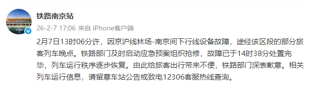 2月7日13时06分许,因京沪线林场-南京间下行线设备故障,途经该区段的部分旅客列车晚点。铁路部 门及时启动应急预案组织抢修,故障已于14时38分处置完毕,列车运行秩序逐步恢复。由此给旅客出行 带来不便,铁路部门深表歉意。相关列车运行信息,请留意车站公告或致电12306客服热线查询。 ...