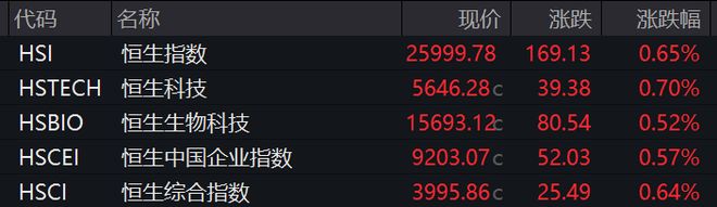 | 代码 | 名称 | 现价 | 涨跌 | 涨跌幅 | | --- | --- | --- | --- | --- | | મટા | 恒生指数 | 25999.78 | 169.13 | 0.65% | | HSTECH 恒生科技 | | 5646.28c | 39.38 | 0.70% | | HSBIO | 恒生生物科技 | 15693.12c | 80.54 | 0.52% | | HSCEI | 恒生中国企业指数 | 9203.07 c | 52.03 | 0.57% | | HSCI | 恒生综合指数 | 3995.86c | 25.49 | 0.64% | | TVDEIM | 74.600 | 2.19% | | --- | --- | --- | | 0981.HK | | | | 比亚迪电子 | 33.580 | 2.19% | | 0285.HK | | | | 地平线机器人-W | 7.630 | 1.87% | | 9660.HK | | | | 同程旅行 | 21.720 | 1.78% | | 0780.HK | | | | 京东健康 | 68.200 | 1.64% | | 6 ...