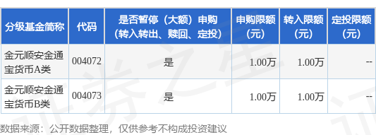 以上内容为证券之星据公开信息整理,由AI算法生成(网信算备310104345710301240019号),不构成 投资建议。 | 分级基金简称 代码 | | 是否暂停(大额)申购 (转入转出、赎回、定投) | | 申购限额 转入限额 定投限额 | (元) | | --- | --- | --- | --- | --- | --- | | | | | (元) | (元) | | | 金元顺安全通 宝货币A类 | 004072 | 를 | 1.00万 | 1.00万 | | | 金元顺安金通 宝货币B类 | 004073 | 를 | 1.00万 | 1.00万 | | 证券之星消息,11月13日金元顺安基金管理有限公司发布《金元顺安金通宝货币市场基金基金暂停(大 额)申购(转换转入、赎回、转换转出、定期定额投资)公告》。公告中提示,为保证本基金的稳定运 作,保护基金份额持有人利益,自2025年11月13日起金元顺安金通宝货币市场基金基金暂停(大额)申 购(转换转入、赎回、转换转出、定期定额投资),申购、转换转入上限金额为1.0万元,下属分级基 金调整明细如下: ...