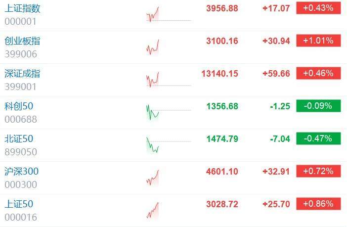 | 上证指数 | | 3956.88 | +17.07 | +0.43% | | --- | --- | --- | --- | --- | | 000001 | 70 | | | | | 创业板指 | | 3100.16 | +30.94 | +1.01% | | 399006 | | | | | | 深证成指 | | 13140.15 | +59.66 | +0.46% | | 399001 | | | | | | 科创50 | | 1356.68 | -1.25 | -0.09% | | 000688 | | | | | | 北证50 | | 1474.79 | -7.04 | -0.47% | | 899050 | | | | | | 沪深300 | | 4601.10 | +32.91 | +0.72% | | 000300 | | | | | | FJE50 | | 3028.72 | +25.70 | +0.86% | | 000016 | | | | | 格隆汇11月19日|A股主要指数拉升,创业板指涨1.01%,沪指涨0.43%,深成指涨0.46%,军工、锂 矿、保险、水产养殖等方向领涨,沪 ...