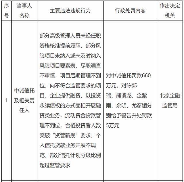 10月17日,国家金融监督管理总局北京监管局发布的行政处罚信息显示,中诚信托及相关责任人因违法 违规遭重罚。 | 序 | 当事人 | 主要违法违规行为 | 行政处罚内容 | 作出决定 | | --- | --- | --- | --- | --- | | 름 | 名称 | | | 机关 | | 1 | 中诚信托 及相关责 | 部分高级管理人员未经任职 | | | | | | 资格核准提前履职,部分风 | | | | | | 险项目未纳入或未及时纳入 | | | | | | 风险项目要素表,尽职调查 | | | | | | 不审慎,项目后期管理不到 | 对中诚信托罚款660 | | | | | 位,向不符合监管要求的项 | 万元,对陈郭 | | | | | 目、企业提供融资,以投资 | 瑞、熊胥龙、金紫 | 北京金融 | | | | 永续债权的方式变相开展融 | 雨、余明、尤彦媚分 | 监管局 | | | 任人 | | | | | | | 资类业务,流动资金贷款管 | 别给予警告并处罚款 | | | | | 理不到位,合格投资者人数 | 5万元 | | | | | 突破"资管新规" 要求,个 | | | | | ...