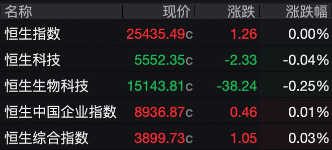 12月10日,恒生指数开盘微涨,恒生科技指数跌0.04%。 | 名称 | 现价 | 涨跌 | 涨跌幅 | | --- | --- | --- | --- | | 恒生指数 | 25435.49c | 1.26 | 0.00% | | 恒生科技 | 5552.35c | -2.33 | -0.04% | | 恒生生物科技 | 15143.81c | -38.24 | -0.25% | | 恒生中国企业指数 | 8936.87 c | 0.46 | 0.01% | | 恒生综合指数 | 3899.73c | 1.05 | 0.03% | | 比亚迪股份 | 97.050 | -0.97% | | --- | --- | --- | | 1211.HK | | | | 金山软件 | 28.980 | -0.89% | | 3888.HK | | | | 腾讯音乐-SW | 72.000 | -0.76% | | 1698.HK | | | | 京东集团-SW | 114.300 | -0.52% | | 9618.HK | | | | 零跑汽车 | 49.940 | -0.32% | | 9863.HK | | | ...