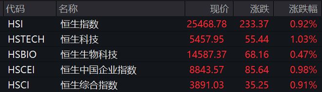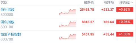 12月17日,午后三大指数快速拉升回暖,结束2连跌行情。 恒生科技指数尾盘一度涨至1.4%,最终收涨1.03%,恒生指数、国企指数分别上涨0.92%及0.98%。 | 名称: | | 最新价 | 涨跌额 涨跌幅 ^ | | --- | --- | --- | --- | | 恒生指数 | 11 11 - 1 | 25468.78 | +233.37 +0.92% | | 800000. | | | | | 国企指数 | 5 ww | 8843.57 | +85.64 +0.98% | | 800100 | | | | | 恒生科技指数 | 125 | 5457.95 | +55.44 +1.03% | | 800700 | Min | | | 大型科技股回暖,美团、快手、百度涨近2%,腾讯、京东、阿里巴巴均涨超1%。中泰证券指出,美联 储降息符合预期,港股短期流动性风险有所下降,而中央经济工作会议的积极信号带动市场风险偏好回 升。科技板块在流动性风险下行趋势下或保持相对韧性,政策面强调创新驱动,为科技成长板块注入强 心剂,与" 新质生产力 "相关的前沿科技领域仍将是资金关注的焦点。 | 代码 | 名称 | 最 ...
