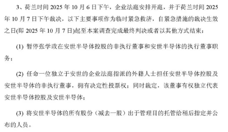 暂停张学政在安世半导体控股的执行董事与CEO 职权,并将闻泰科技全资子公司裕成控股持有的 99% 股权交由第三方托管。 10月 7 日,庭审裁决进一步明确,上述措施将持续至调查终结,同时新增一名拥有决定性投票权的独立外籍董事。 文|高见pro 10月12日,闻泰科技发布一则公告,其核心半导体子公司安世半导体(Nexperia)遭遇了一场来自荷兰政府与公司部分外籍高管的"内外夹 击",导致闻泰科技对安世半导体暂时失去了控制权。 根据公告,事件发展如下: 10月1日,荷兰企业法庭应安世半导体外籍高管请求,法庭生效临时措施: 也就是说,闻泰科技对安世半导体失去了控制权。而这一切,始于9月30日的那道政令。 当日,荷兰经济事务与气候政策部下达部长令,要求安世半导体全球30个主体在一年内,不得对资产、知识产权、业务及人员进行任何调 整。 从荷兰政府下达部长令,到中方CEO被暂停职务、股权被托管,一场针对年收入147亿元的半导体企业的控制权争夺,在短短七日内尘埃 落定。 这七天内究竟发生了什么,使安世半导体控制权变天?这起事件的背后,又透露出哪些信息? 荷兰政企联动,"合规夺权"? 这场控制权争夺战的一大疑点在于,荷兰政 ...