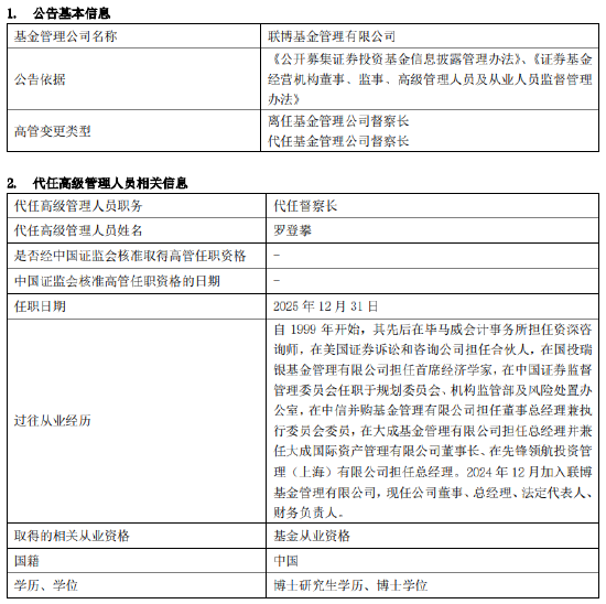 近日,联博基金管理有限公司发布高级管理人员变更公告,督察长方芳因个人原因于2025年12月31日离 任,其职责暂由总经理罗登攀代行。此次看似常规的人事变动,因另一则公开信息而受到市场额外关 注:几乎同一时间,上海市高级人民法院官网披露,联博基金前副总经理朱建荣诉公司的"劳动争议"一 案,将于2026年1月19日开庭审理。核心合规负责人的离任,与前高管对簿公堂的纠纷相继出现,使这 家尚处发展初期的外资独资公募基金,面临内部治理与管理文化的舆论审视。 然而,另一则关联信息让此次变动显得不同寻常。公开资料显示,联博基金原副总经理朱建荣于2024年 6月任职,2025年9月即因"个人原因"离任,且未转任公司其他岗位。其离职仅三个月后,与公司之间的 劳动争议便正式步入司法程序。尽管案件具体细节尚未公开,但前高管以诉讼方式解决劳动争议,在讲 究"体面"的金融圈内并不常见,这通常暗示双方在离职环节存在较大分歧,可能涉及薪酬、绩效、职责 或解雇程序等多个方面。 | 基金管理公司名称 | 联博基金管理有限公司 | | --- | --- | | 公告依据 | 《公开募集证券投资基金信息披露管理办法》、《证券基金 经营机构董事、 ...