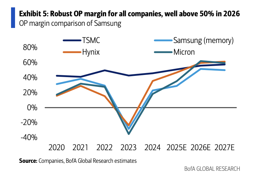 Core Viewpoint - The global memory chip industry is transitioning towards a "foundry-like" business model characterized by reduced cyclicality, stable prices, and increasing profit margins, supported by various factors including significant price increases in DRAM and NAND markets [1][2]. Group 1: Market Dynamics - DRAM and NAND spot prices have seen substantial increases, with DDR4 prices rising over 2000% month-on-month as of early 2026 [1]. - The memory chip industry is expected to maintain a high prosperity level, forming a "super cycle" focused on profit margins, despite potential slowdowns in average selling price (ASP) increases after Q2 2026 [2]. - The DRAM spot market is experiencing extreme tightness, with DDR4 and DDR5 prices showing weekly increases of approximately 10%, continuing a trend of 100%-200% cumulative increases since Q4 2025 [6][9]. Group 2: Competitive Landscape - TSMC's optimistic growth guidance, projecting a 30% compound annual growth rate (CAGR) through 2026 and maintaining over 20% annual growth through 2029, positively impacts SK Hynix, which holds over 60% of the global HBM supply [3][5]. - The competitive landscape is shifting, with TSMC's technological advancements in 2nm processes and CoWoS packaging limiting Samsung's ability to catch up, as evidenced by Samsung's ongoing losses in its foundry business compared to TSMC's profit margins exceeding 50% [5]. Group 3: Investment Sentiment - Investor sentiment is divided, with some optimistic about AI-driven long-term growth in the memory sector, while others express caution over high valuations and sustainability of momentum [1][2]. - There are concerns regarding the historical high price-to-book ratios after 2-3 years of industry growth, alongside rising capital expenditures from leading firms like Samsung [1][2]. Group 4: Future Outlook - The NAND market may face new supply-demand balance pressures by the end of 2026 due to capacity releases and transitions to advanced processes [2]. - Korean semiconductor export data reflects ongoing high industry prosperity, with a 46% year-on-year increase in semiconductor exports in early January 2026, maintaining a historical high level [10].