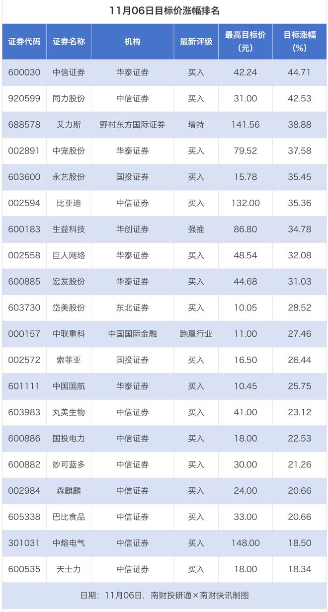 Core Insights - On November 6, 29 target price adjustments were made by brokerages for listed companies, with notable increases for CITIC Securities, Tongli Co., and Ailis, showing target price increases of 44.71%, 42.53%, and 38.88% respectively, across the securities, engineering machinery, and chemical pharmaceutical industries [1][2]. Group 1: Target Price Increases - CITIC Securities received a target price increase to 42.24 yuan, representing a 44.71% increase [2]. - Tongli Co. was assigned a target price of 31.00 yuan, reflecting a 42.53% increase [2]. - Ailis was given a target price of 141.56 yuan, indicating a 38.88% increase [2]. - Other companies with significant target price increases include Zhongchong Co. (37.58%), Yongyi Co. (35.45%), and BYD (35.36%) [2]. Group 2: Brokerage Recommendations - A total of 109 listed companies received brokerage recommendations on November 6, with notable mentions including Teruide, Jinghe Integration, and Fuyao Glass, each receiving two recommendations [3][4]. - Teruide had a closing price of 30.30 yuan and was in the electric grid equipment sector [4]. - Jinghe Integration closed at 32.99 yuan in the semiconductor industry [4]. - Fuyao Glass had a closing price of 67.51 yuan, operating in the automotive parts sector [4]. Group 3: Rating Changes - Tianfeng Securities upgraded the rating for Taisheng Wind Power from "Hold" to "Buy" on November 6 [5]. - Three companies received initial coverage from brokerages, including Daimai Co. (rated "Buy"), Zhongji Huanjie (rated "Hold"), and Hengli Hydraulic (rated "Hold") [6].
