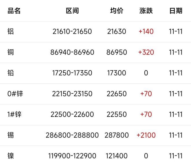| 品名 | 区间 | 均价 | 涨跌 | 日期 | | --- | --- | --- | --- | --- | | 铝 | 21610-21650 | 21630 | +140 | 11-11 | | 铜 | 86940-86960 | 86950 | +320 | 11-11 | | 铝 | 17250-17350 | 17300 | 0 | 11-11 | | 0#锌 | 22150-23150 | 22650 | +70 | 11-11 | | 1#锌 | 22500-22600 | 22550 | +70 | 11-11 | | 锡 | 286800-288800 287800 +2100 | | | 11-11 | | 誤 | 119900-122900 121400 | | 0 | 11-11 | 来源:世铝网 11日有色宝长江A00铝21610~21650均价21630涨140,前三日均价21457,前五日均价21424 ...