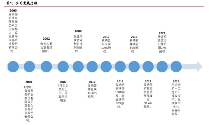 业务聚焦国内西部地区,整合多品种矿产资源。2000 年西部矿业有限责任公司设 立青海西部矿业股份有限公司, 2001 年青海西部矿业股份有限公司更名为西部矿 业股份有限公司,2007 年 7 月西部矿业股份有限公司在上交所 挂牌上市。经过多 年发展,公司业务规模和领域逐渐扩大,目前业务涉及铜、铅、锌、铁、钼等金属 的采选、冶 炼和贸易,以及黄金、白银等稀贵金属和硫精矿等产品的生产及销售。 公司控股股东为西矿集团,实控人为青海省国资委。截至 2025 年 11 月 27 日,公 司控股股东为西部矿业集团有 限公司((简称( 西矿集团"),直接和间接持股比例合 计为 30.94%。公司实控人为青海省国资委,直接持有西 矿集团 71.07%股权。公 司背靠青海省国资委下属大型矿业集团,未来发展有望受益于西矿集团在资源保障、 技 术创新和贸易流通等方面优势。 公司业务实现了从矿山采选到有色冶炼、金融贸易和盐湖化工等多领域布局。公司 坐拥丰富的矿产资源,为业务 开展奠定了坚实的资源基础。主营业务贯穿矿产全产 业链,具体包括铜、铅、锌、钼、镍、铁和钒的采选、冶炼 和贸易,同时从事稀有 金属((如黄金、白银)以及非金属产品 ...