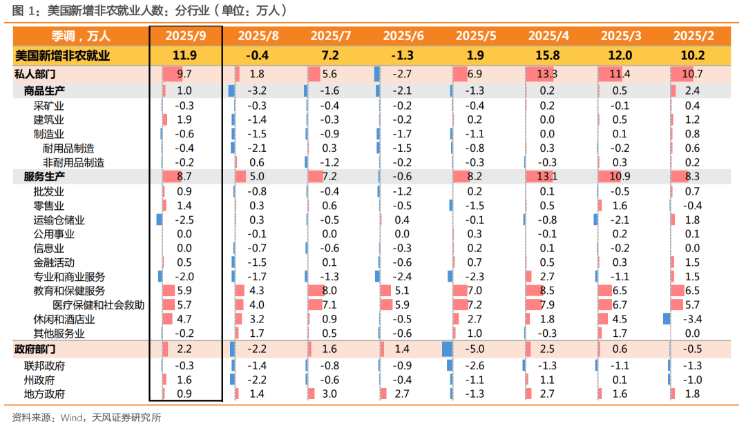 来源:天风研究 市场走势纠结,美债收益率和美元下行、幅度有限;或反映了虽然9月非农强劲,但对就业担忧仍存。美股开盘上涨,纳指受英伟达财报的推动涨幅领 先,而后盘中集体翻绿。我们预计,若12月美联储按兵不动,或并不是降息周期的结束、而是将降息次数推迟至明年。 美国9月非农新增就业11.9万人,高于预期的5万人,8月数据由2.2万人下修2.6万至-0.4万;7月数据由7.9万人下修7000人至7.2万。美国9月失业率4.4%,高 于预期的4.3%,前值4.3%。 非农在连续4个月的低迷后,9月重返强健势头。但需注意,这是份"过时"的报告,本应在10月初发布、拖欠了近7周。真实的经济温度仍需观察11-12月数 据情况。 分行业看: 1)教育和医疗、休闲和酒店业是9月非农超预期的主要因素,分别新增5.9万和4.7万就业,共计占全部新增就业的89%; 2)批发零售、建筑业、金融业、政府部门就业好转、录得小幅正增长; 3)制造业就业依旧低迷,9月减少0.6万人,虽然特朗普大力推进制造业回流,但在关税阴云下,制造业就业持续承压。 失业率超预期上行,首要原因是劳动力扩张,9月劳动参与率上升至62.4%,预期62.3%;次要原 ...