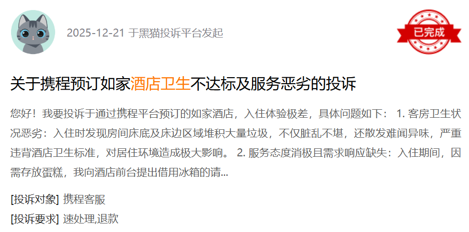 近日,胡先生(化名)入住成都春熙路福朋喜来登酒店的"天际景观套房"。刚进浴室就看到令他作呕的一幕:墙壁上爬满30多只活飞 虫,密密麻麻,虫体还蠕动。 他立刻联系酒店,值班经理只口头道歉,提出补偿10000积分和一盒茶叶。 胡先生自称是万豪集团长达7年的会员,目前已升至钛金级别,非常信赖这个品牌。这次特意选择生日当天入住,用积分兑换了5晚套 房,没想到卫生如此糟糕。据查,他入住的"天际景观套房"价格约为1400元-1600元一晚。 胡先生对酒店的态度感到不满,直接联系万豪集团,对方却表示,集团无法约束旗下酒店,如果酒店不配合,则"无法保障会员权 益",最终方案是只能补偿积分。 如今住宿"高价低质"的乱象屡见不鲜。当住宿遭遇"卫生不达标""服务敷衍"等问题时,消费者应该运用怎样的避坑技巧和维权方法, 才能有效捍卫自身权益呢? 当下,消费者选择高端住宿,追求的不仅是硬件设施的舒适,更包括干净卫生的居住环境和匹配价位的服务品质。而在黑猫投诉 【下载黑猫投诉客户端】平台上,涉及酒店卫生差、服务恶劣、酒店敷衍处理等相关问题的投诉并不少见。 黑猫投诉平台消费者投诉截图 黑猫投诉平台消费者投诉截图 在黑猫投诉平台上,一位消费 ...
