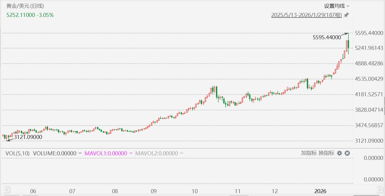 格隆汇1月30日丨就在刚刚,本来集体狂欢的贵金属、有色金属们,在刷新记录新高后遭到资金获利了结,出现了快速跳水,下跌速度之快,可以用"来不及 报盘"来形容。具体来看: ①最炙手可热的现货白银,从盘中最高的+4%转为下跌超8%,直接从记录新高的121美元下挫至107美元。 ②现货黄金盘中一度逼近5600美元/盎司,但北京时间23:00持续跳水,一度重挫5%,下探至5100美元附近。 ③正在交易中的沪金、沪银期货夜盘出现短时大幅下跌行情,最深度下跌幅度达6%,而他们1个小时前还分别涨超2%、8%。 白银/美元 (日线) 112.50500 -3.68% 2025/5/13-2026/ 001746 000 407 000 "," VOL(5,10) VOLUME:0.00000 – MAVOL1:0.00000 – MAVOL2:0.00000 – 加指标 06 07 08 09 10 11 12 《 ⑤美股也在大幅走低,道琼斯指数跌0.60%,标普500指数跌1.35%,纳斯达克综合指数跌2.47%。 ⑥比特币跌至84818.5美元,过去24小时内跌5.16%。 斯巴达资本证券分析师彼得·卡迪略指出,黄金和白银 ...