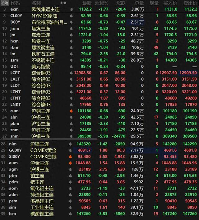 截至日间收盘,内盘基本金属集体下跌,且除了沪铜、沪铝外,其余金属跌幅均超1%,沪锡以高达 5.98%的跌幅领跌,沪铅跌2.33%,沪锌跌1.91%,沪镍跌1.42%。氧化铝主连跌1.19%,铸造铝主连跌 0.11%。 此外,碳酸锂主连跌3.83%,工业硅主连涨1.61%,多晶硅主连涨0.63%。欧线集运主连跌1.77%报 1132.2。 来源:上海有色网 金属市场: 【国家统计局:2026年我国有基础、有条件保持经济稳定向好运行】国家统计局局长康义在国新办新闻 发布会上表示,从开年以来,生产价格预期都出现了积极变化,经济稳中有进的态势在持续。2025年12 月份,规模以上服务业增加值、服务业生产指数同比增速均比上月有所加快;核心CPI涨幅也连续4个 月保持在1%以上,PPI同比降幅收窄,环比连续三个月回升;制造业PMI和非制造业商务活动指数双双 重回扩张区间。从政策支撑看,国常会部署实施财政金融协同的一揽子政策。扩大内需,"两新"政策也 在不断优化,这些都为今年经济的起步创造了有利条件。从2026年全年看,我国经济长期向好的支撑条 件和基本趋势没有改变,高质量发展的大势没有改变,有基础、有条件保持经济稳定向好 ...