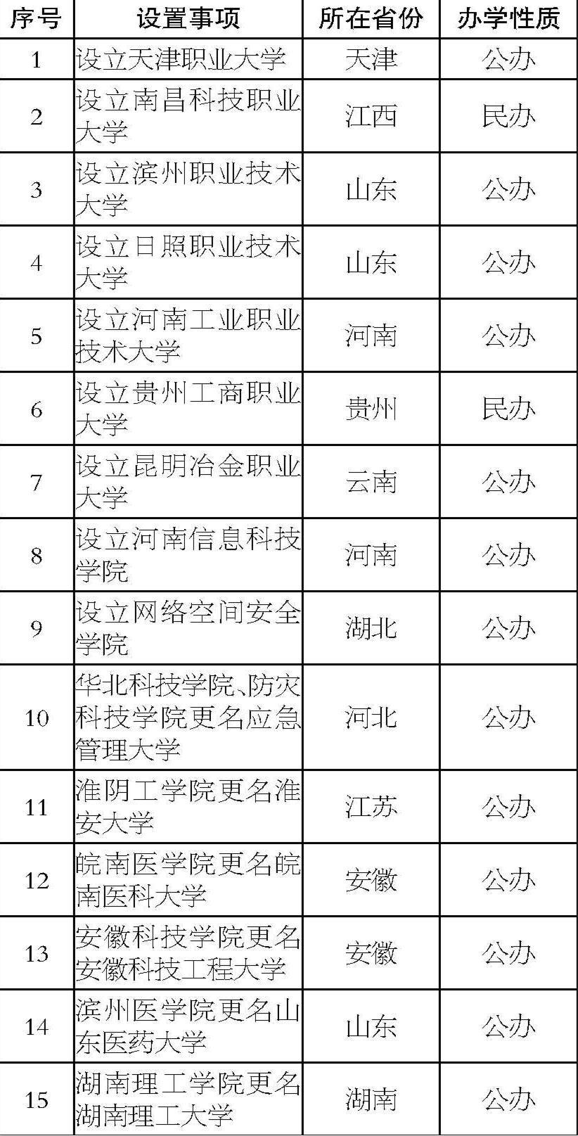 | 序号 | 设置事项 | 所在 | 办学 | | --- | --- | --- | --- | | | | 省份 | 性质 | | 1 | 设立天津职业大学 | 天津 | 公办 | | 2 | 设立南昌科技职业大学 | 江西 | 民办 | | 3 | 设立滨州职业技术大学 | 山东 | 公办 | | 4 | 设立日照职业技术大学 | 山东 | 公办 | | 5 | 设立河南工业职业技术大学 | 河南 | 公办 | | 6 | 设立贵州工商职业大学 | 贵州 | 民办 | | 7 | 设立昆明冶金职业大学 | 云南 | 公办 | | 8 | 设立河南信息科技学院 | 河南 | 公办 | | 9 | 设立网络空间安全学院 | 湖北 | 公办 | | 10 | 华北科技学院、防灾科技学院更名应急管理大 学 | 河北 | 公办 | | 11 | 淮阴工学院更名淮安大学 | 江苏 | 公办 | | 12 | 皖南医学院更名皖南医科大学 | 安徽 | 公办 | | 13 | 安徽科技学院更名安徽科技工程大学 | 安徽 | 公办 | | 14 | 滨州医学院更名山东医药大学 | 山东 | 公办 | | ા ર | 湖南 ...
