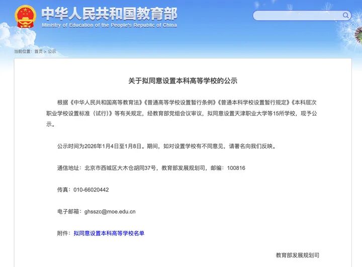 名单中有9所为新设高校,包括天津职业大学、网络空间安全学院等7所公办院校,以及南昌科技职业大 学、贵州工商职业大学两所民办院校。 公开资料显示,网络空间安全学院的举办者为武汉市人民政府,办学所在地为武汉市临空港经济技术开 发区,定位为新型高水平应用型网络安全大学。(完) 本次公示显示,根据《中华人民共和国高等教育法》《普通高等学校设置暂行条例》《普通本科学校设 置暂行规定》《本科层次职业学校设置标准(试行)》等有关规定,经教育部党组会议审议,拟同意设置 天津职业大学等15所学校。 根据本次公示名单,华北科技学院、防灾科技学院更名为应急管理大学,淮阴工学院更名为淮安大学, 皖南医学院更名为皖南医科大学,安徽科技学院更名为安徽科技工程大学,滨州医学院更名为山东医药 大学,湖南理工学院更名为湖南理工大学。 中新社北京1月4日电 中国教育部4日发布关于拟同意设置本科高等学校的公示,拟同意设置天津职业大 学、网络空间安全学院等15所学校。 ...