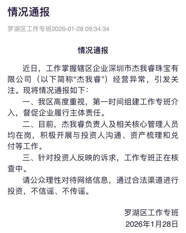 1月28日,针对深圳水贝黄金预定价平台"杰我睿"兑付困难事件,深圳市罗湖区工作专班发布公告称, 近日,工作掌握辖区企业"杰我睿"经营异常,引发关注。罗湖区第一时间组建工作专班介入,督促企业 履行主体责任。目前,杰我睿负责人及相关核心管理人员均在岗,积极开展与投资人沟通、资产梳理和 兑付等工作。 据了解,事件中的"杰我睿"运营方为深圳市杰我睿珠宝有限公司,企查查信息显示,杰我睿成立于2014 年,主营业务为有色金属及矿石批发。该公司原为水贝地区黄金原料交易商,从上游供货方采购、回收 黄金原料,向下游小商户供货。深圳水贝有"中国黄金集散地"之称。国际黄金价屡创新高,有商家在这 个风潮下,以高价收购黄金,进行一场"黄金对赌"。 1月19日,"杰我睿"平台出现异常的消息在多个用户微信群流传。大量用户反映自己被平台"拉黑",无 法继续交易。同时,社交平台开始出现"杰我睿出现挤兑"的短视频,有消费者提现时系统显示前方有数 千人排队等待打款。 1月25日,杰我睿公告称,将每日兑付金额限定为1克黄金或等值500元现金,并称已主动申请政府部门 对全部资产进行监管,强调资产未被转移,具体处置方案仍需协商,预计需7至15天方可处理 ...