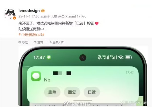 小米澎湃OS3短信通知新增已读按钮,正陆续推送
